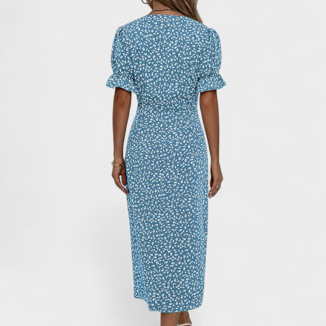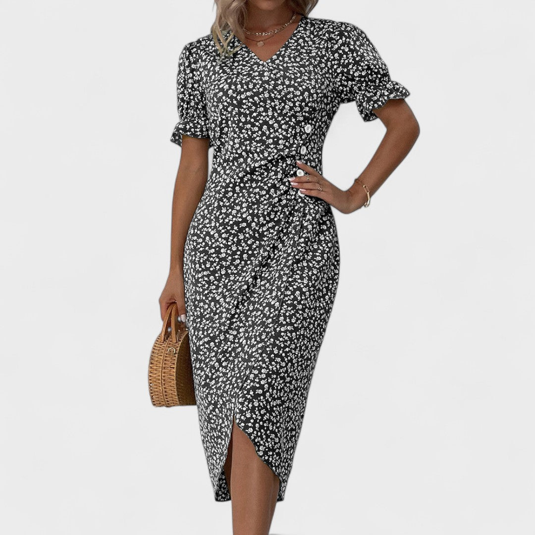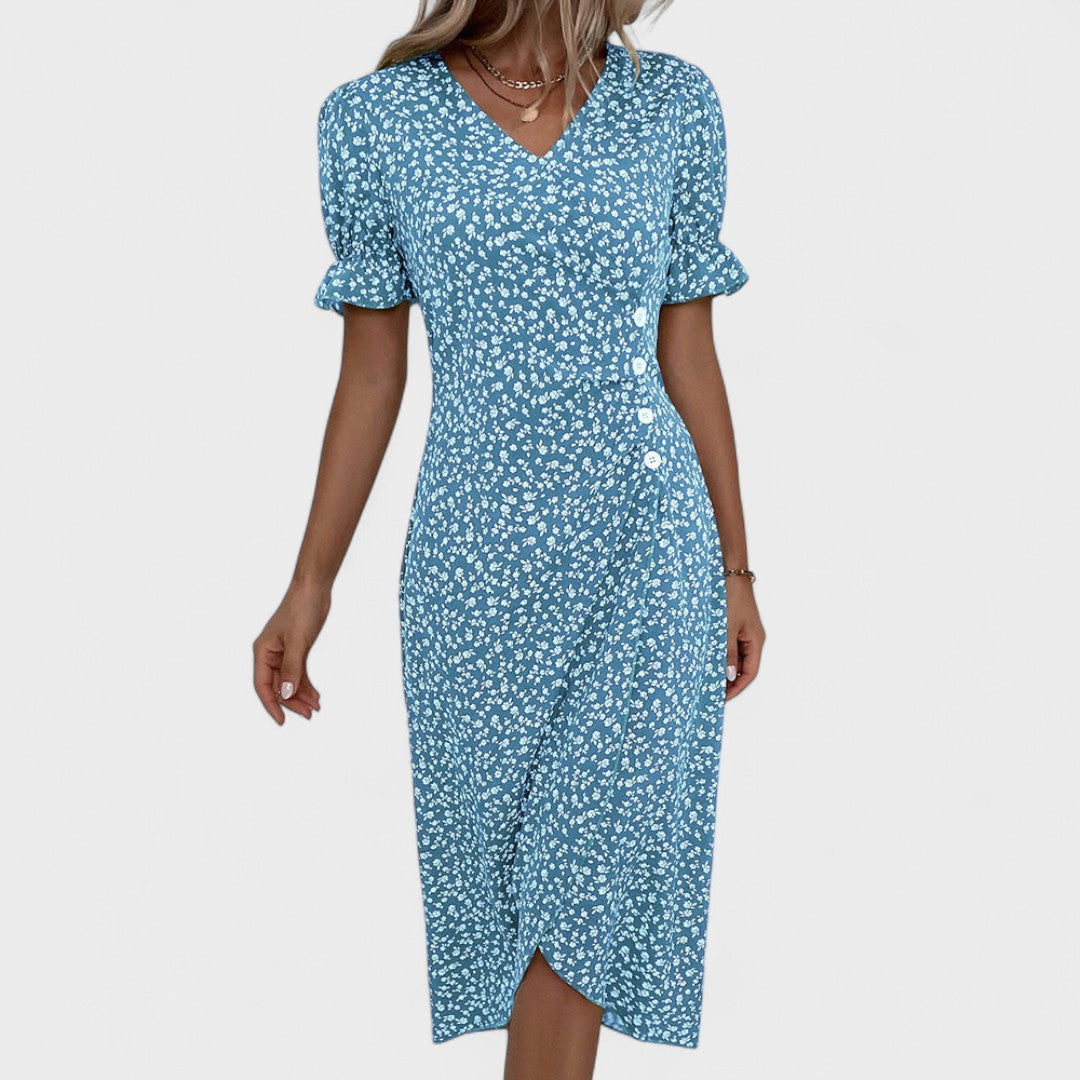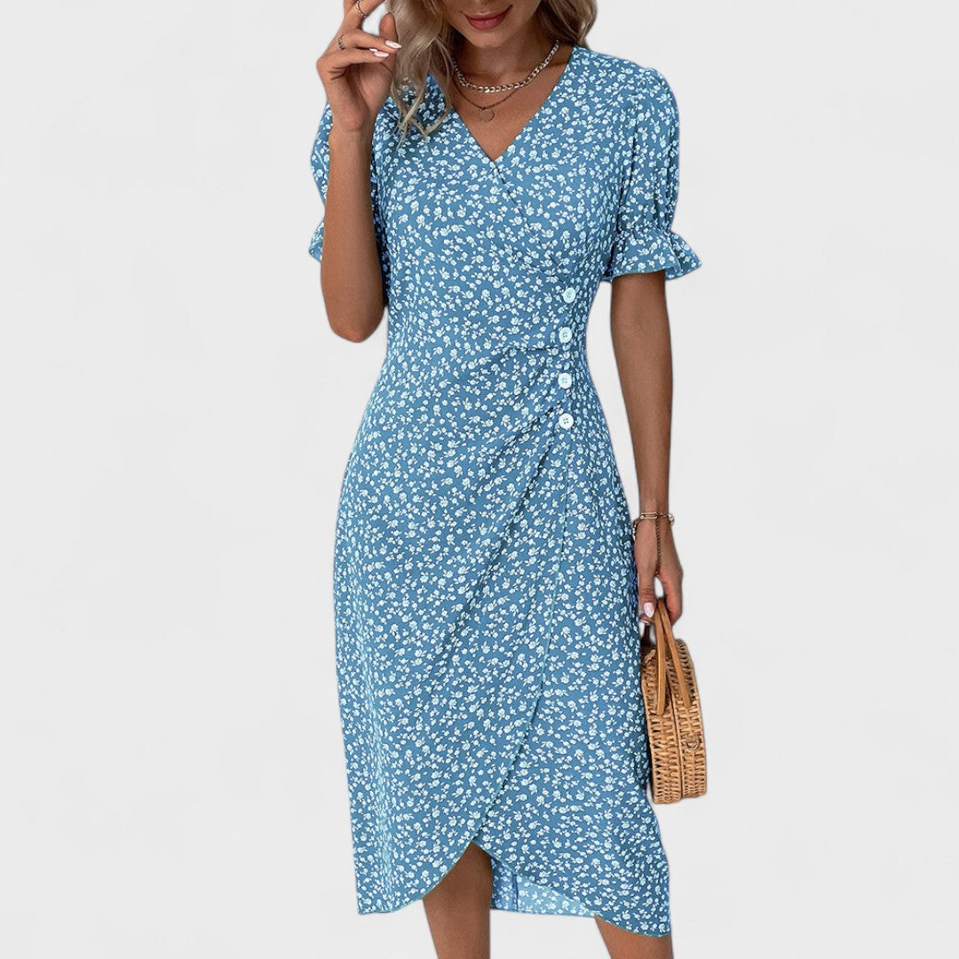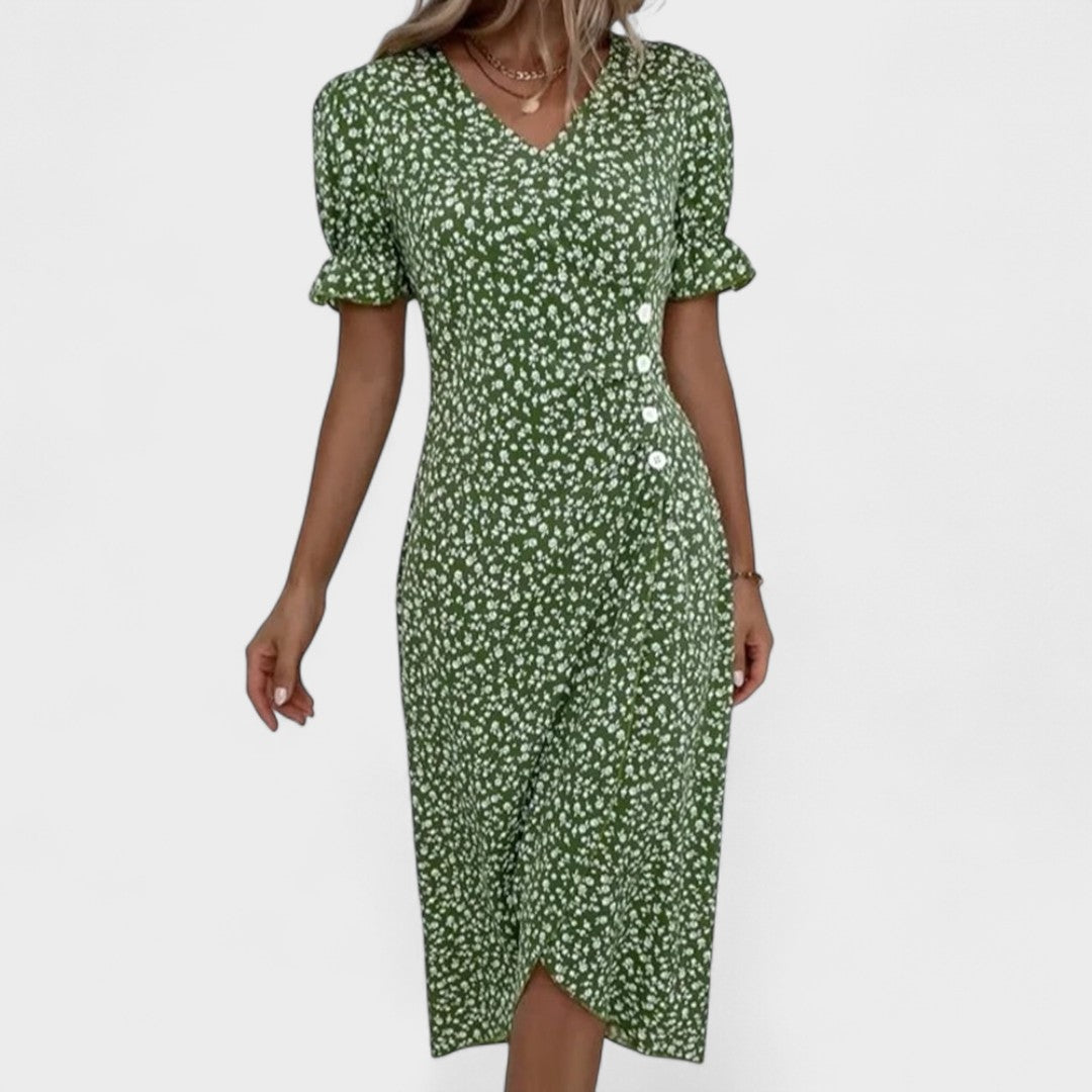 Este encantador vestido verde com padrão floral é a escolha perfeita para quem procura leveza, frescura e um toque de romantismo. Com corte envelope, botões laterais decorativos e mangas com folho, valoriza a silhueta feminina de forma delicada e elegante. Ideal para piqueniques ao pôr-do-sol, passeios de fim-de-semana ou até um brunch entre amigas.