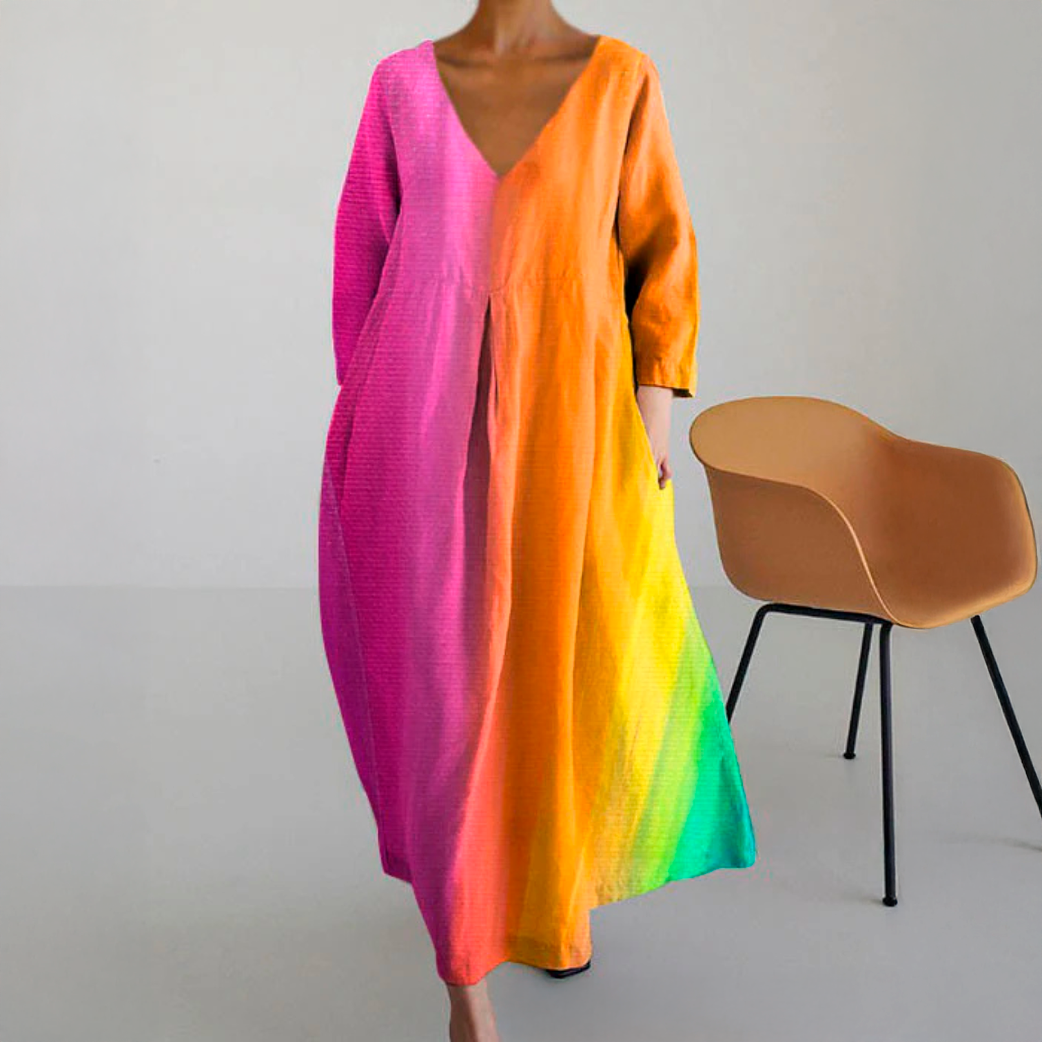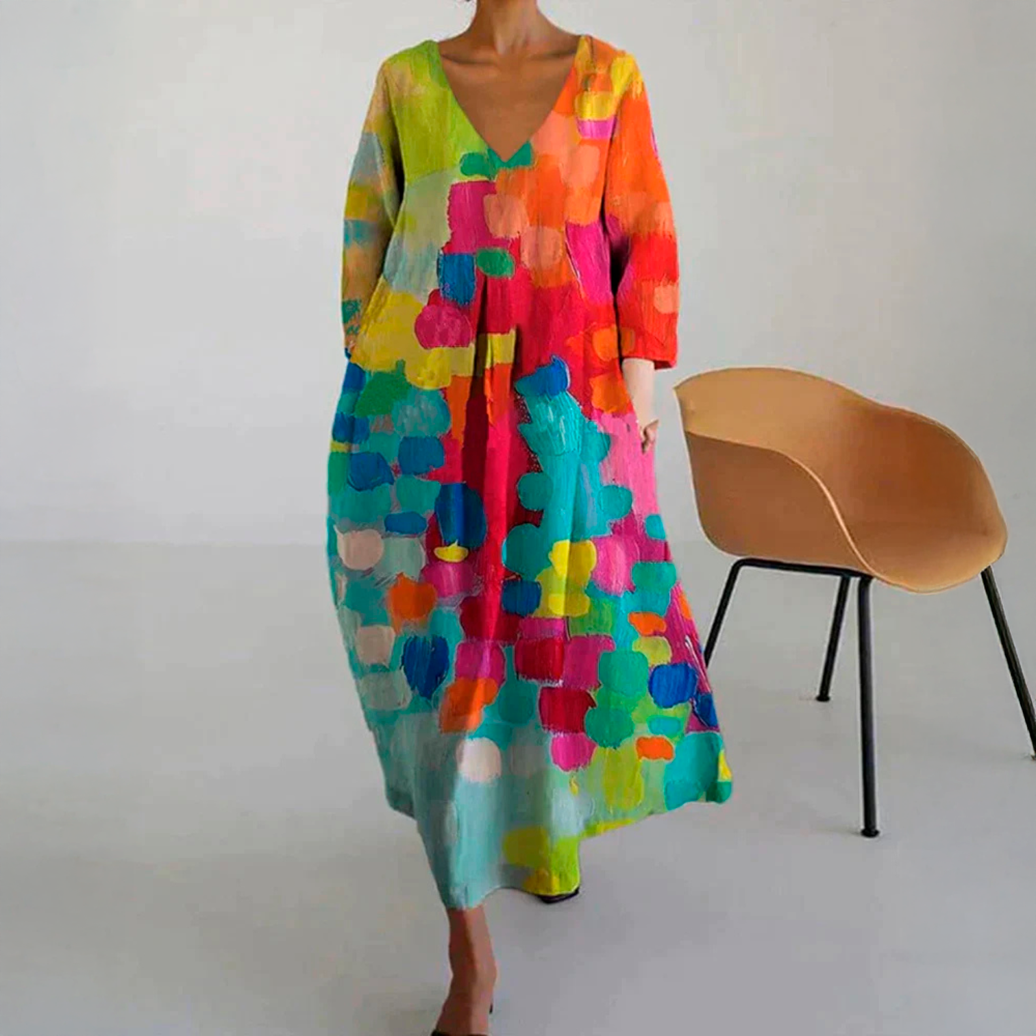 Cheio de charme e personalidade, este vestido combina cores vibrantes com um design sofisticado. O decote em V valoriza a silhueta, enquanto o tecido leve e fluído garante conforto e frescor o dia todo. Perfeito para dias ensolarados, passeios especiais ou eventos descontraídos, este vestido é a escolha ideal para quem busca estilo e versatilidade em uma única peça. Vista-se com alegria e elegância em qualquer ocasião!