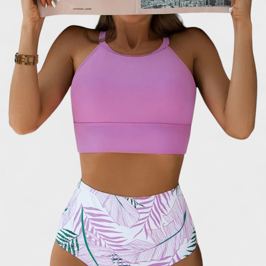 Este biquíni de cintura subida é a escolha ideal para quem procura aliar conforto, estilo e um visual contemporâneo. O top de corte desportivo oferece suporte extra e liberdade de movimentos, enquanto a parte de baixo com estampado botânico confere um ar fresco e sofisticado.