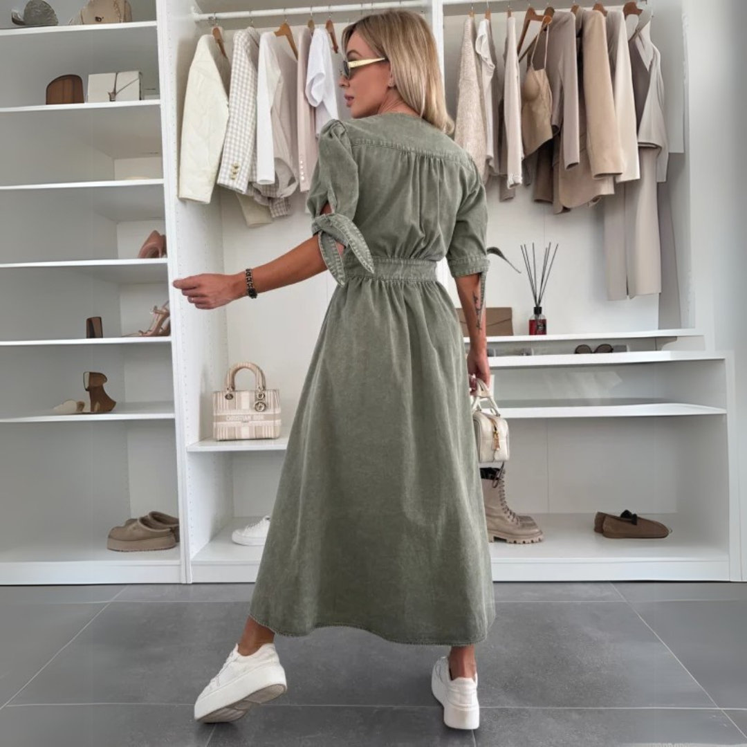 Versatilidade – A cor verde oliva e o tecido tipo jeans tornam este vestido fácil de combinar. Ele pode ser usado com tênis para um look casual ou com saltos para um visual mais elegante.