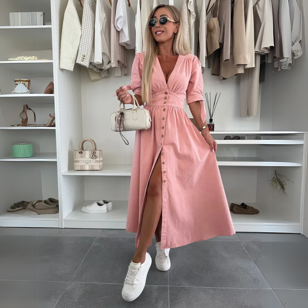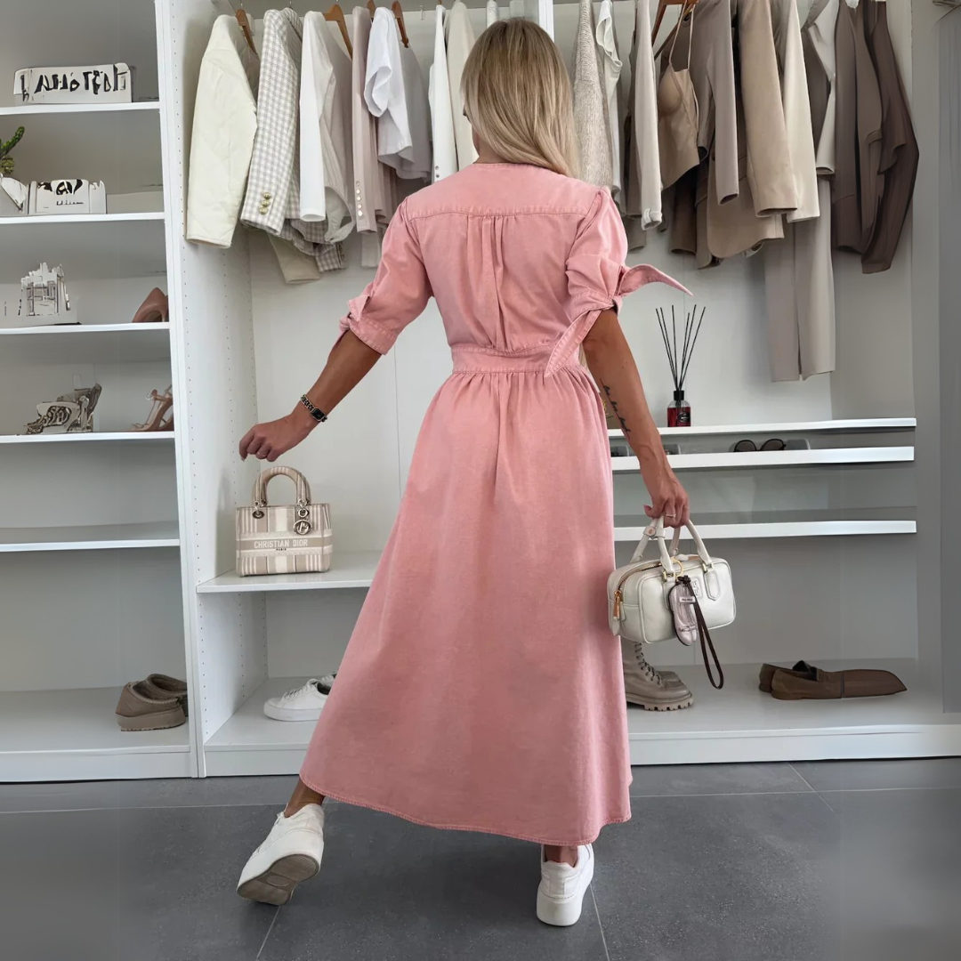 Quer também mostrar-se da sua melhor maneira? Aqueles momentos em que se sente completamente confortável e recebe elogio após elogio. Este vestido elegante faz exatamente isso por si! Com os seus botões de pressões e laços nas mangas, vai certamente atrair olhares!