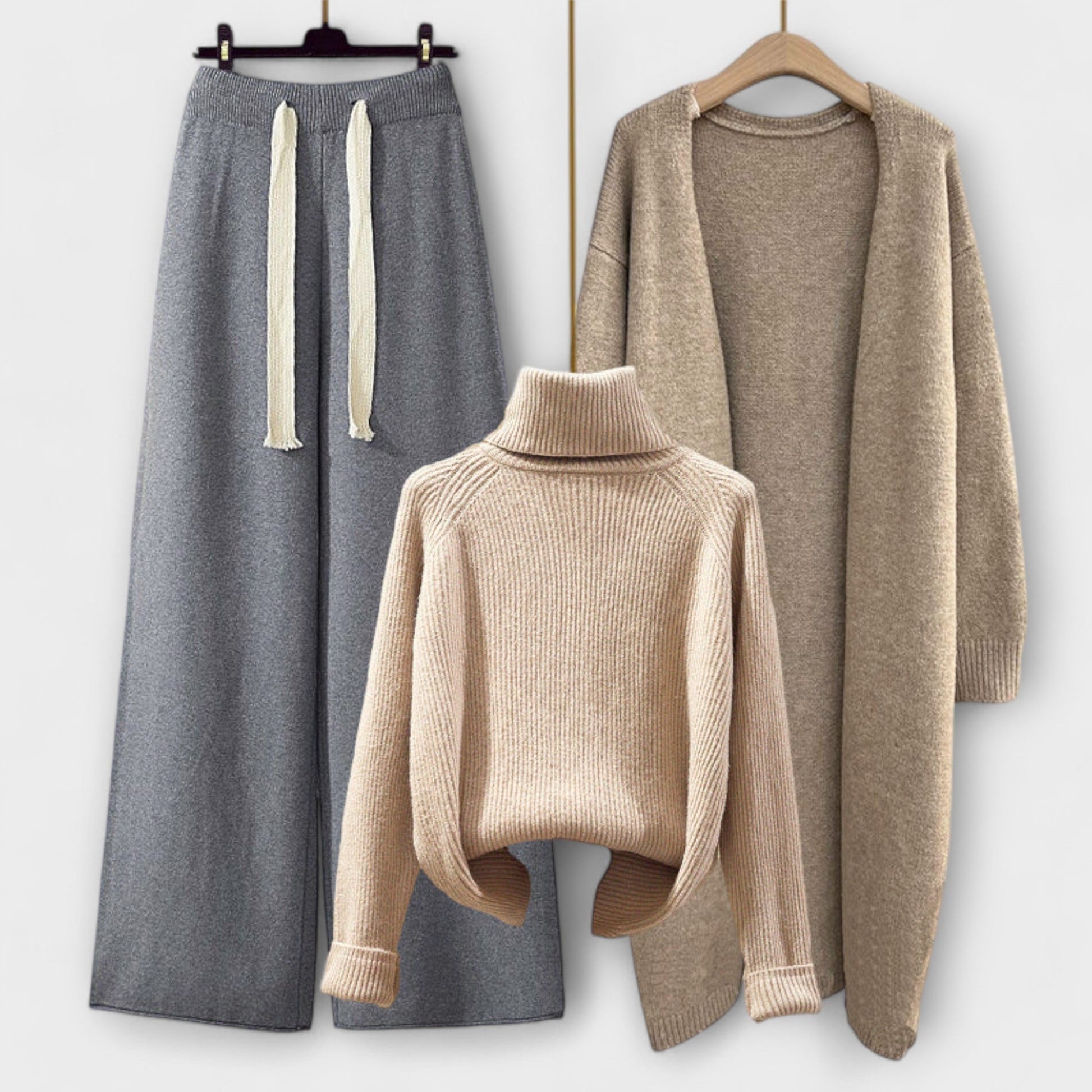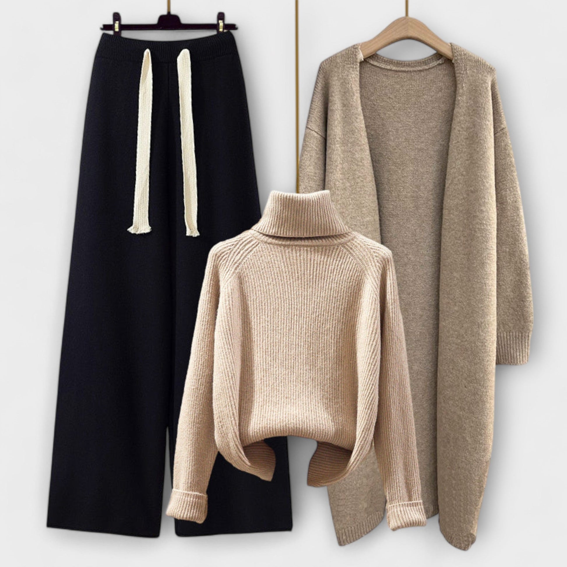 - Conjunto completo de 3 peças – Inclui um suéter de gola alta, um cardigã longo e uma calça de cintura alta e perna larga para um look harmonioso.