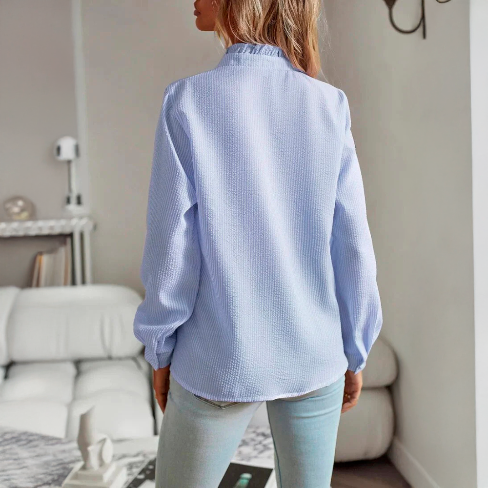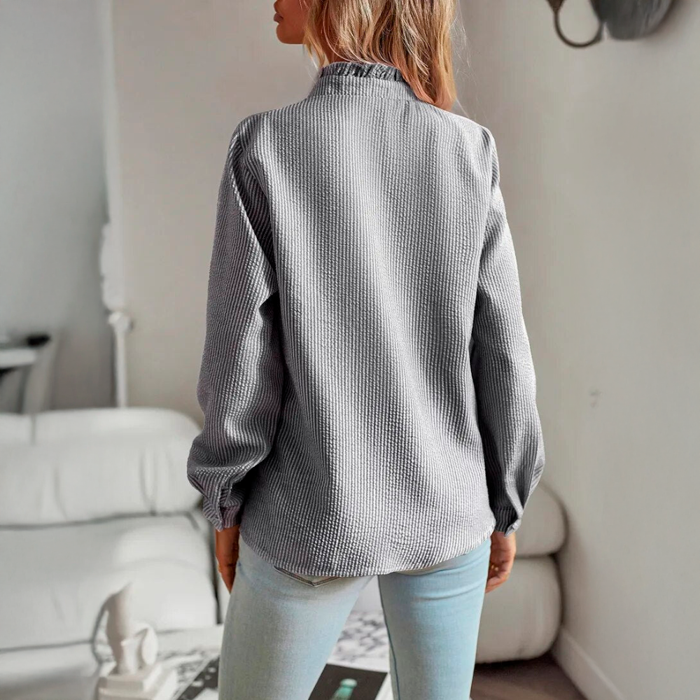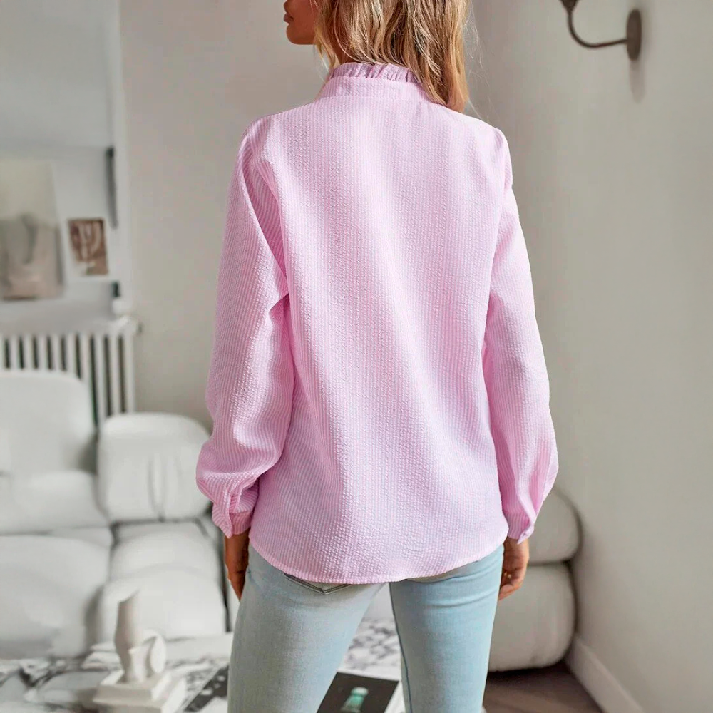 Design elegante - O delicado pormenor do folho ao longo da linha dos botões confere um toque sofisticado e feminino, tornando-o adequado tanto para ocasiões casuais como formais.