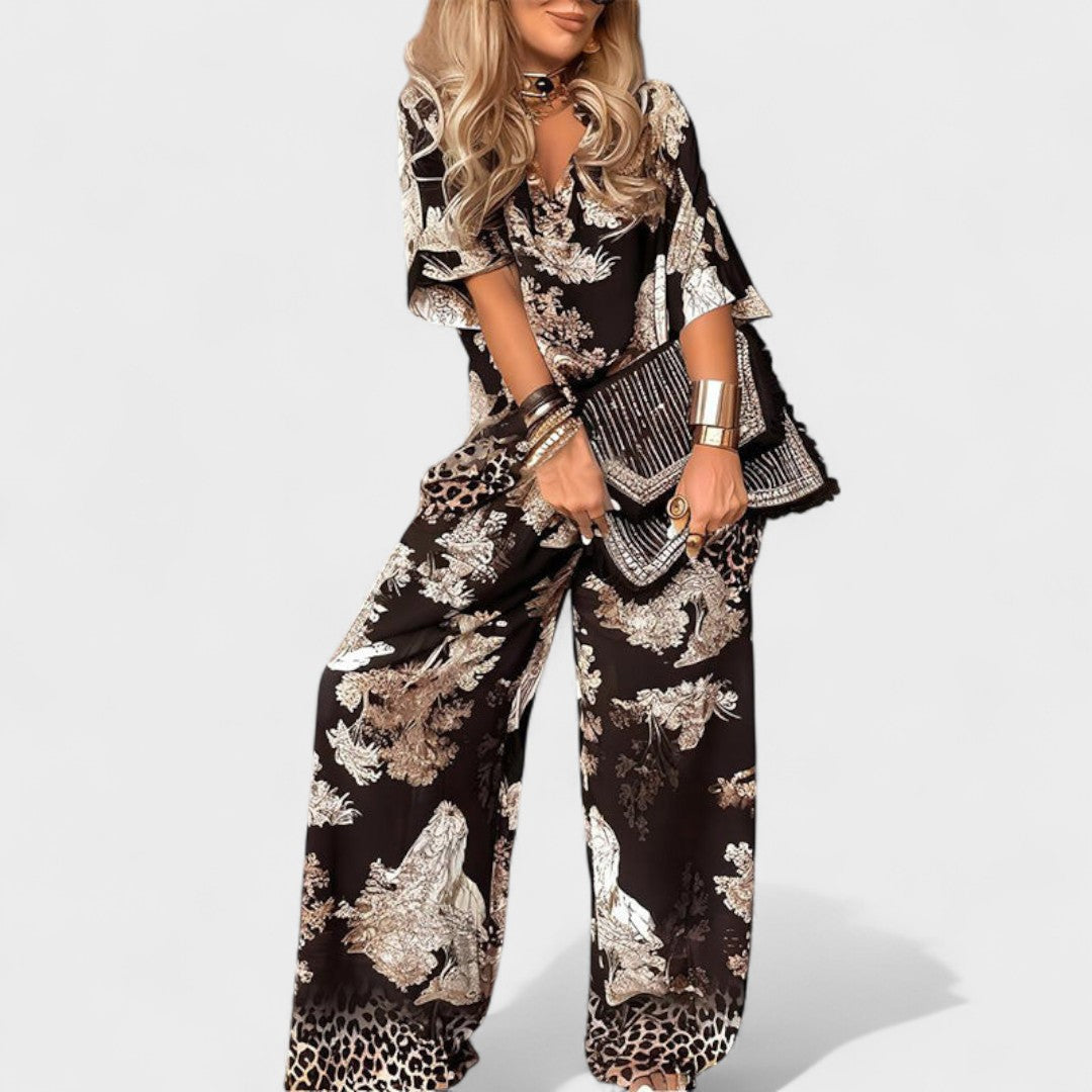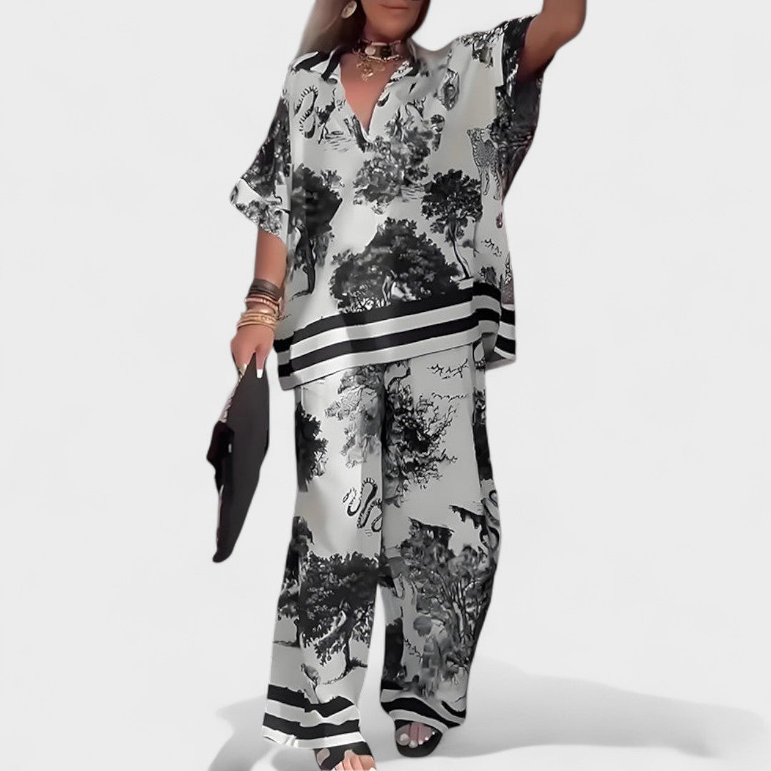 Este conjunto elegante e fluído é a definição perfeita de sofisticação moderna. Com um padrão arrojado e um corte descontraído, proporciona um look imponente sem sacrificar o conforto. Seja para um jantar especial, um evento ou até para dar aquele toque chic ao dia a dia, este conjunto é a escolha certa para quem quer destacar-se com classe.